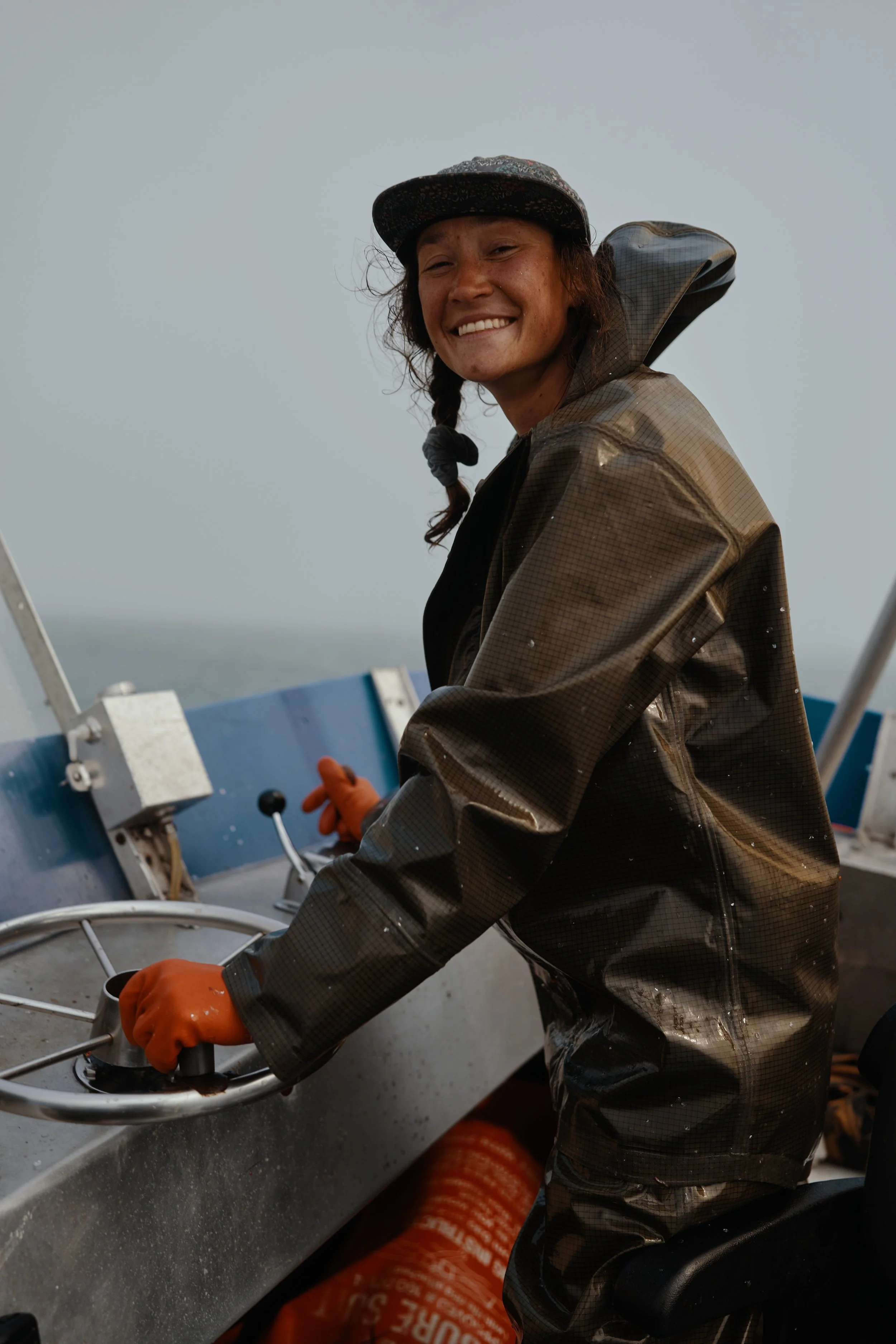 I’m wet. My fingers are pruned. I haven’t showered in 25 days and my hair has matted into what I can only describe as… singularity. For 6 weeks in June and July, I am slave to the swing of the tides, to the wane and wail of the winds, to the sighs of the sea, the swells that swallow my little gillnetter, in her melodious rise and falls. From my delirious trance on the flying bridge, I imagine my 29 mesh deep, 4 ⅞” smokey blue MoMoi, draping over my shoulders, accompanying me down snowy slopes in February.
